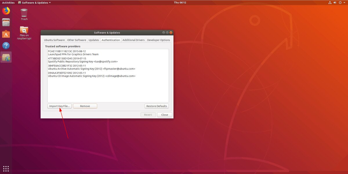 After saving the key to your Ubuntu Linux PC, go back to the “Software & Updates” app, in the “Authentication” section. Then, in the “Authentication” section, look for the “Import Key File” button.