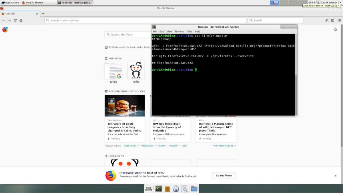 Updating Firefox manually can be a pain. A good way to fix this issue is to make your own update tool. It won’t be nearly as good as using the Debian package manager, but it’s enough to ensure that getting the latest version of Firefox doesn’t become a tedious process. To start off, gain a root shell in the terminal with the su command.