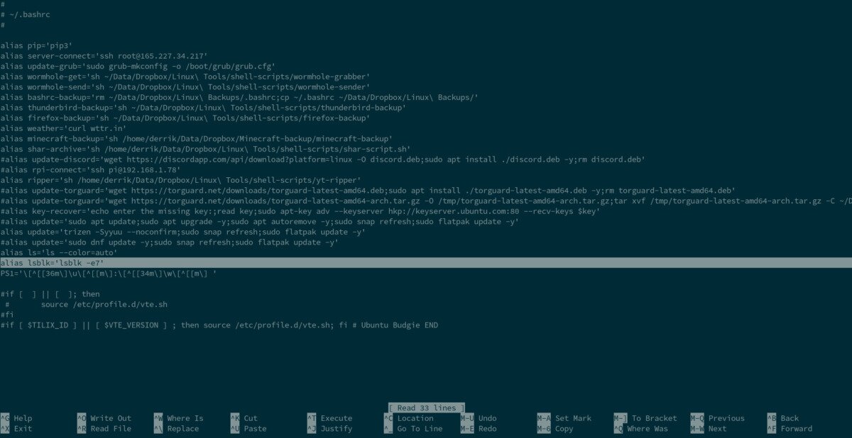 Once inside of the Nano text editor, find a blank space. If your Bashrc file is filled with text, scroll through it, and find somewhere to type and enter the code below. Or, place your new alias directly below existing aliases if you have some already set up.