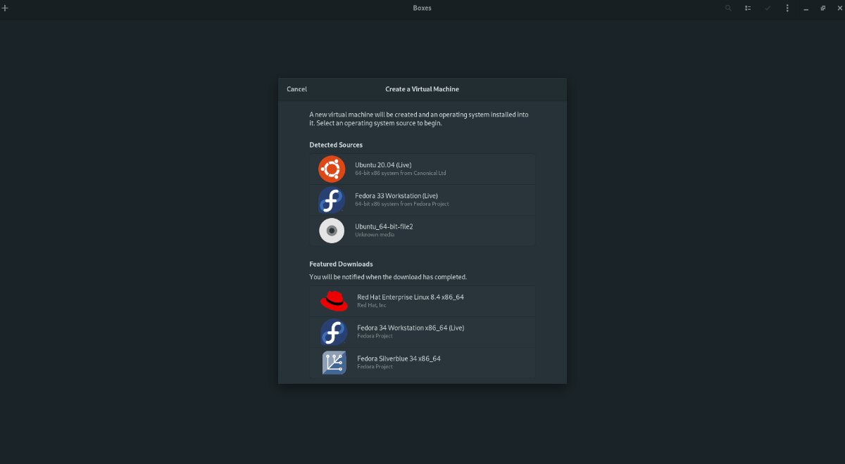 In this menu, locate the “Featured Downloads” menu. In this area, you can download Red Hat Enterprise Linux, Fedora, as well as Fedora Silverblue. Alternatively, if you wish to download a different OS, find “Select an OS Source” and choose the “Operating System Download” option to download any OS directly to Gnome Boxes.