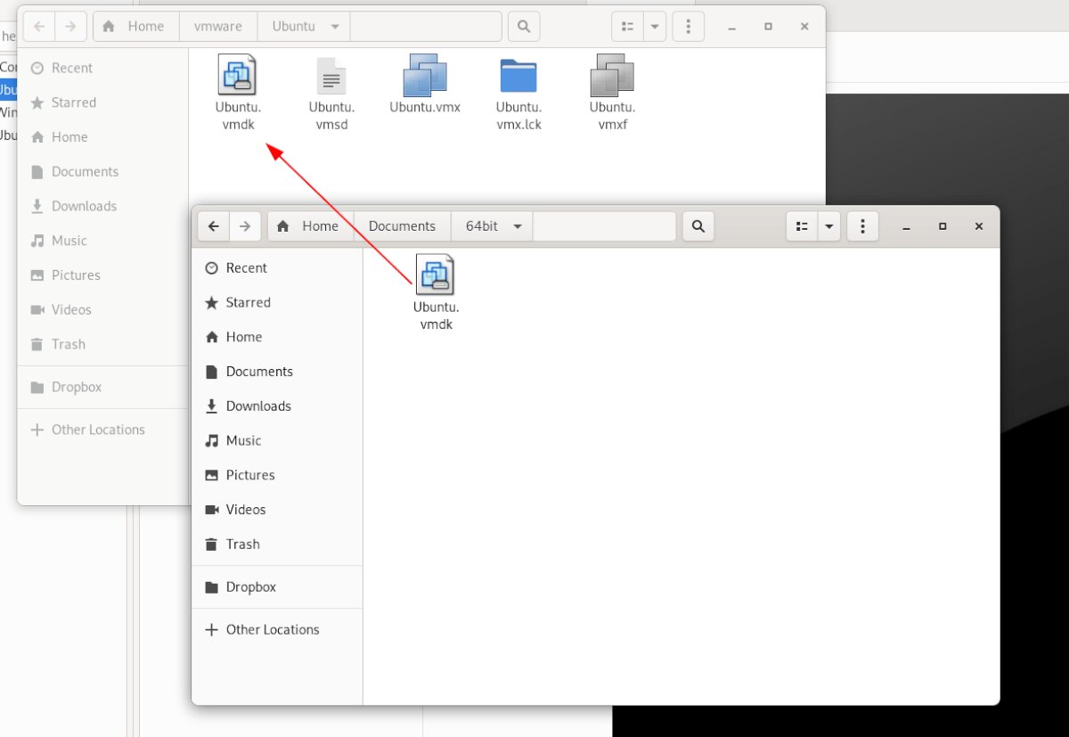 Upon opening up the VM directory, delete Ubuntu.vmdk. Then, open up a second file manager window and drag in the Osboxes “Ubuntu.vmdk” file (which you renamed from “Ubuntu 20.04.2 (64bit).vmdk” to “Ubuntu.vmdk” earlier) into the VM directory.
