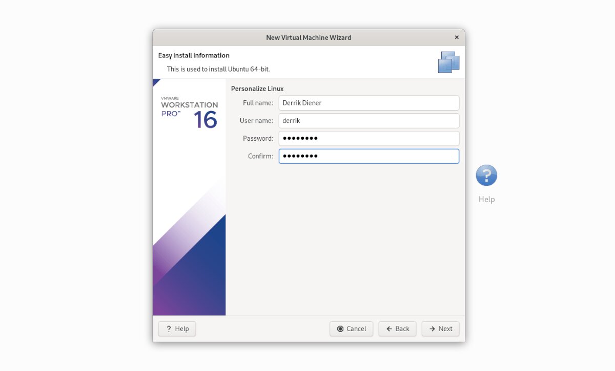 With the ISO loaded into VMware Workstation, you will see “Easy Install Information.” On this page, fill out your full name, preferred Ubuntu username as well as a password. When down, press “Next.”