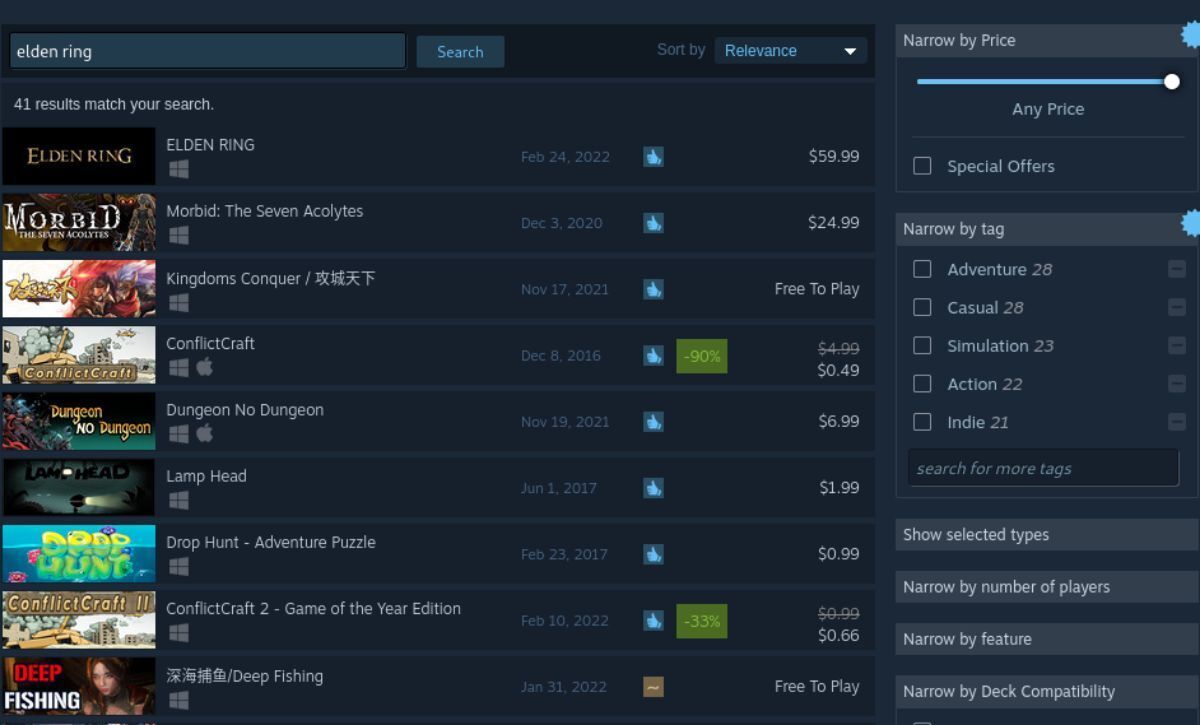 Step 3: Type in “Elden Ring.” Press the Enter key to view the search results. Look through the results for “Elden Ring” and click on it with the mouse to go to the Elden Ring Steam store page.