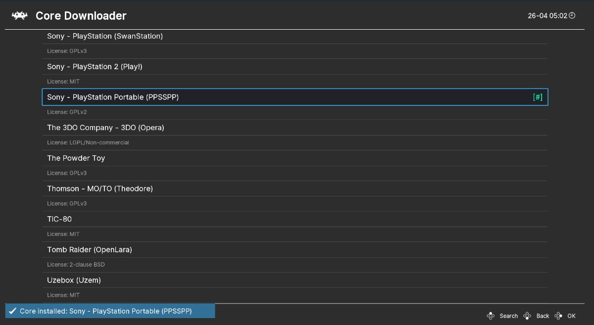 Step 3: After hovering over “Sony – PlayStation Portable,” click or press Enter on the keyboard to access the core in Retro Arch. Then, click on (or select with the keyboard) and select “Sony – PlayStation Portable (PPSSPP)” to install the PSP core.