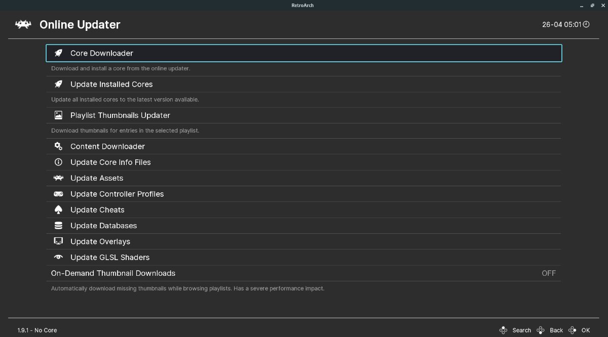 By default, when you install Retro Arch on any Linux distribution, the “Core Downloader” is turned off. Having this feature shut off by default is annoying, but it can be re-enabled by doing the following steps.