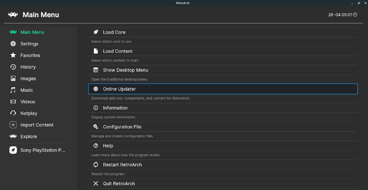 The Sony PSP core is installable through the online updater tool. To do it, launch the Retro Arch app and follow the step-by-step instructions below.