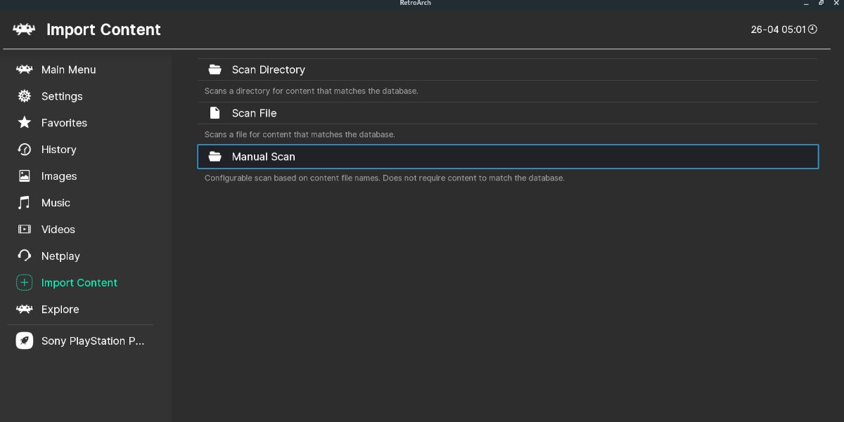To play Sony PSP games in Retro Arch, do the following. First, find the “Import Content” button in Retro Arch, and click on it. By selecting this option, you can add your Sony PSP ROMs to the system.