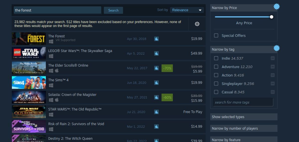 Look through the Steam search results for “The Forest.” Once you’ve found it, select it with the mouse to access The Forest’s Steam games page.