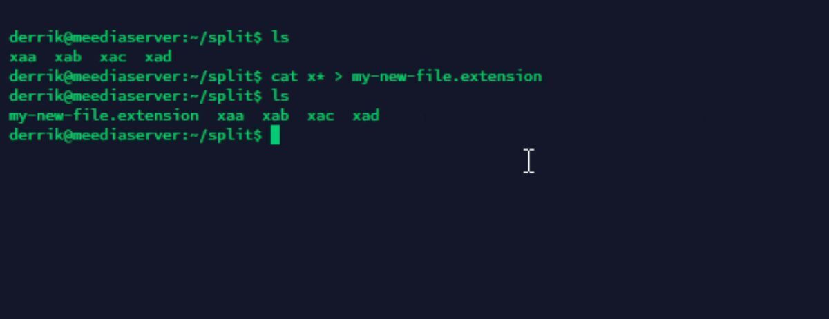 Step 4: Using the cat command, recombine the files that you’ve split using the split command.