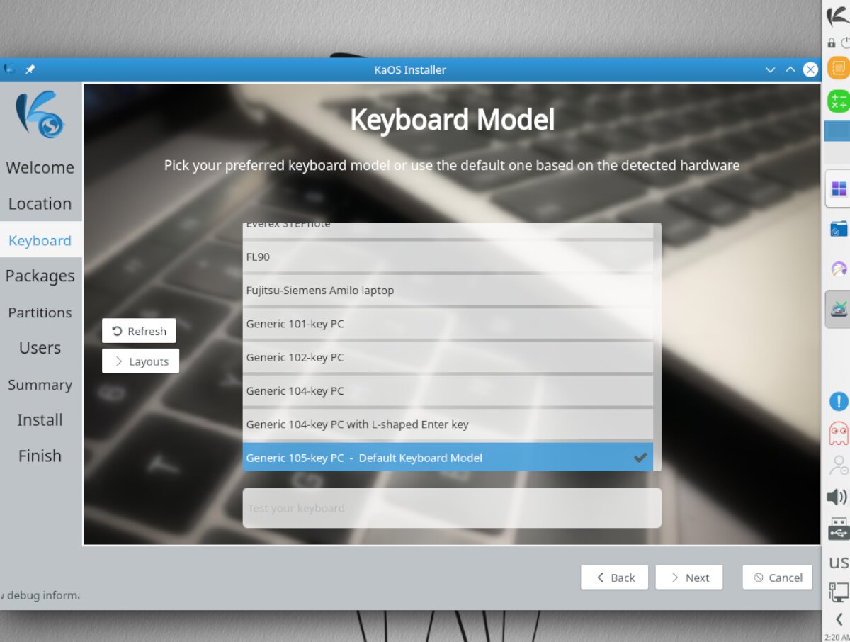 Once you’ve chosen a timezone, the KaOS installer will prompt you to configure your keyboard model. Look through the list to choose your model, or go with what the installer has detected. Click “Next” when done.