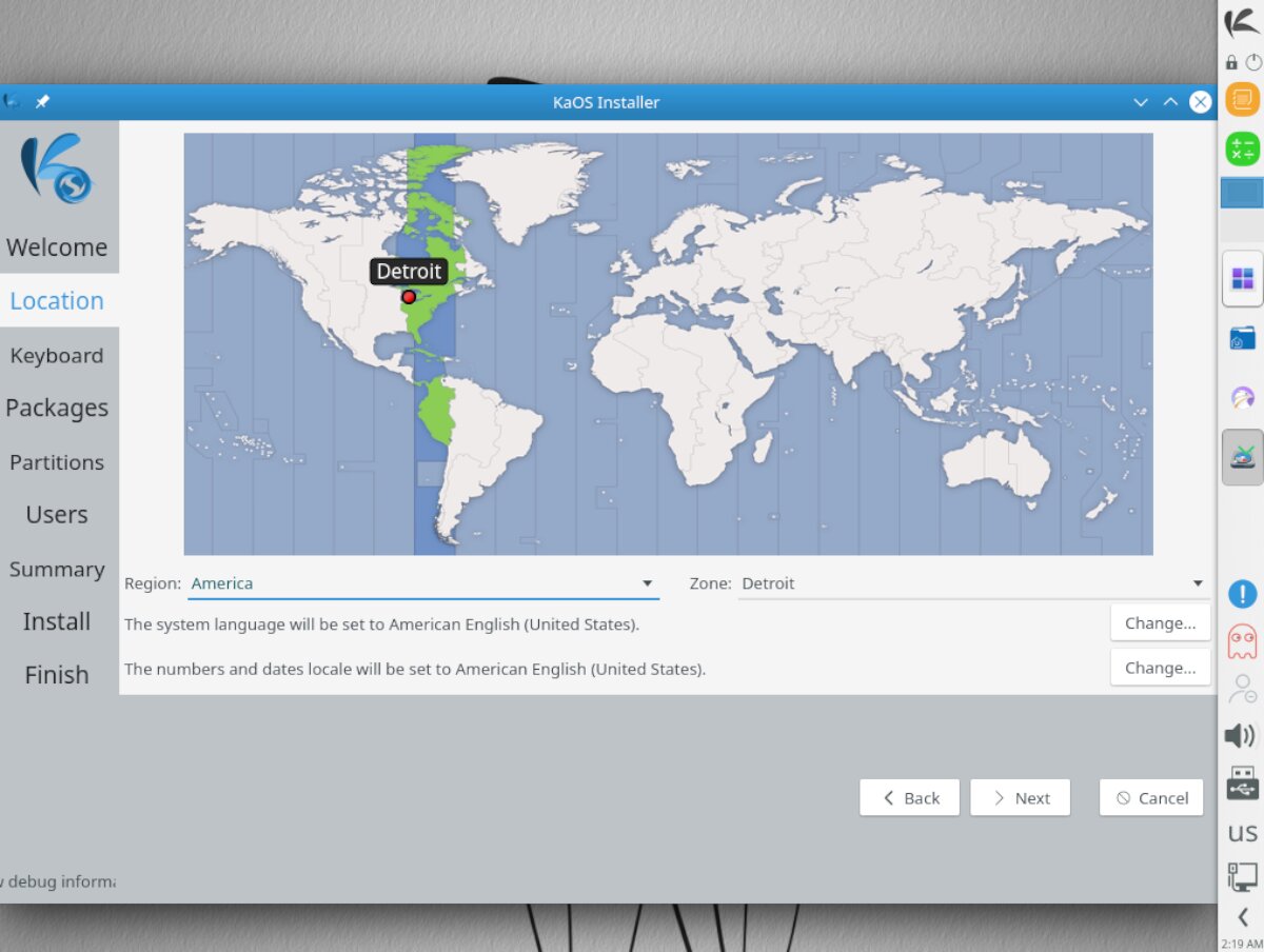 Using the on-screen map, click on the region you live in. This map is used to calculate your timezone so that when KaOS is set up, the PC clock will be accurate. After selecting your timezone, click “Next” to continue.