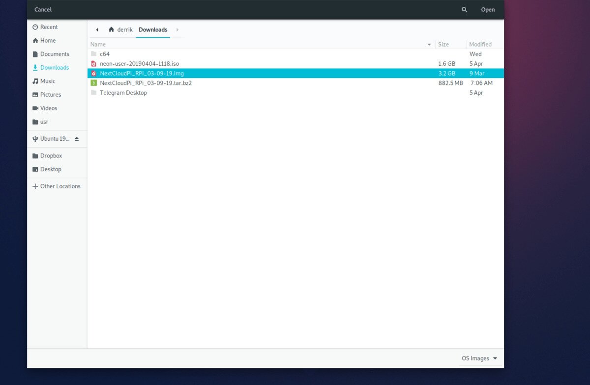 When the NextCloudPi file is done downloading, open up your file manager, click on “Downloads” and do the following.