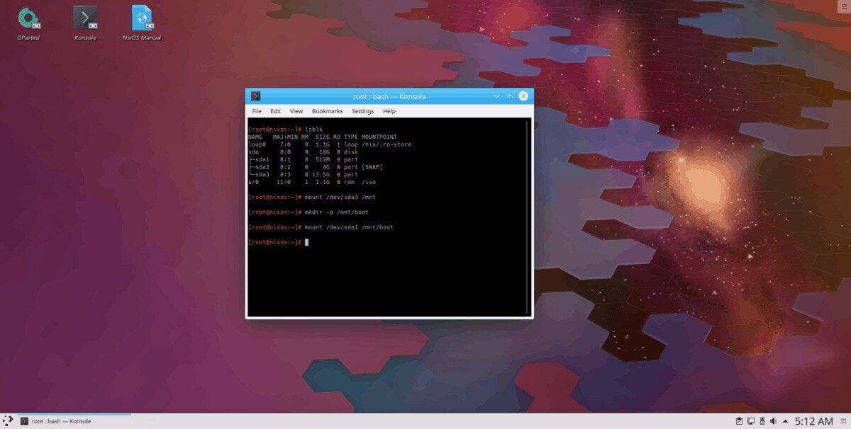With the partitioning done, close Gparted and double-click on the Konsole icon on the desktop to gain access to the command-line in the live disk. Then, run the lsblk command.