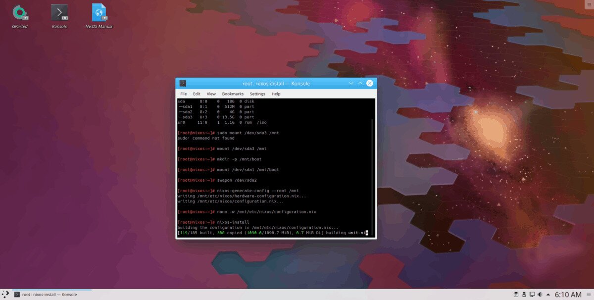 When the terminal is usable again, type reboot to load into your new NixOS system.