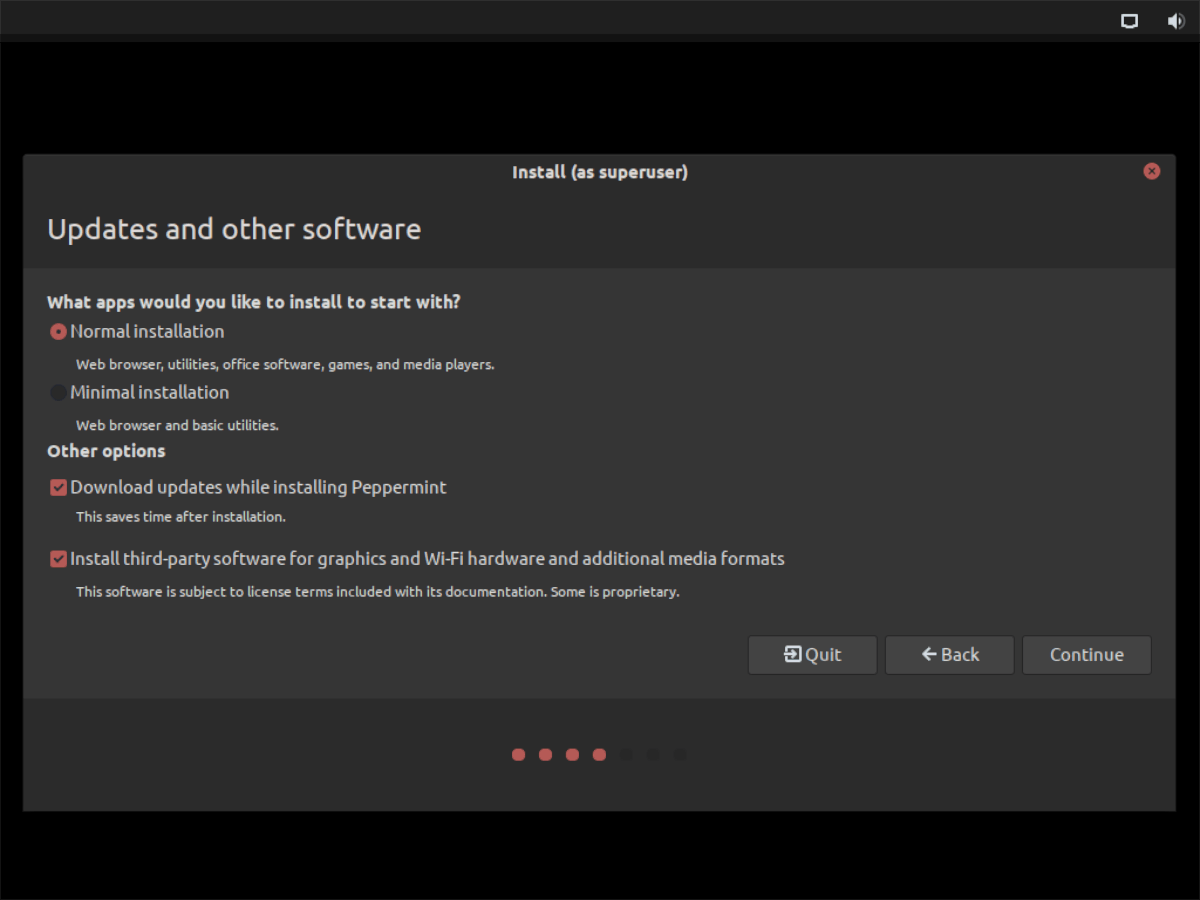 Following the “keyboard layout” section, you’ll get to the “Updates and other software” page. On this page, choose your type of installation (Normal or Minimal). After that, select “Download updates while installing Peppermint” and “Install third-party software.” Then, click the “Continue” button to move to the next page.