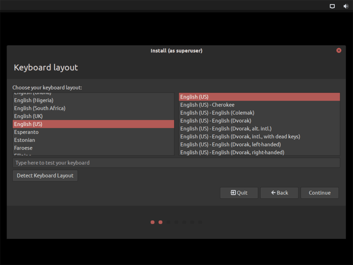On the next page, you must choose your keyboard layout. Using the UI, select your preferred keyboard layout. Then, click the “Continue” button on the bottom to move on.