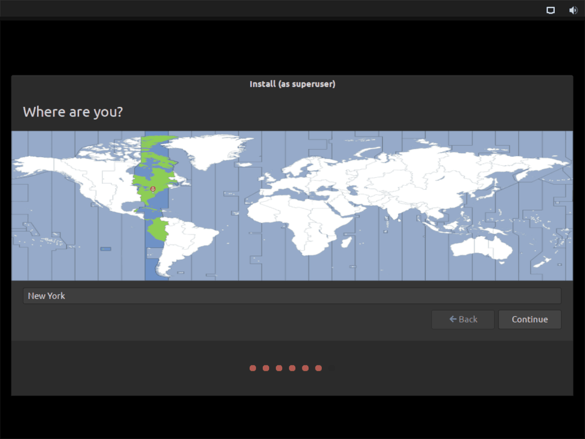 On the “Where are you?” Page, you must tell Peppermint OS what time zone you are in. To do this, select the location you live in on the world map. Then, click “Continue” to confirm the selection.
