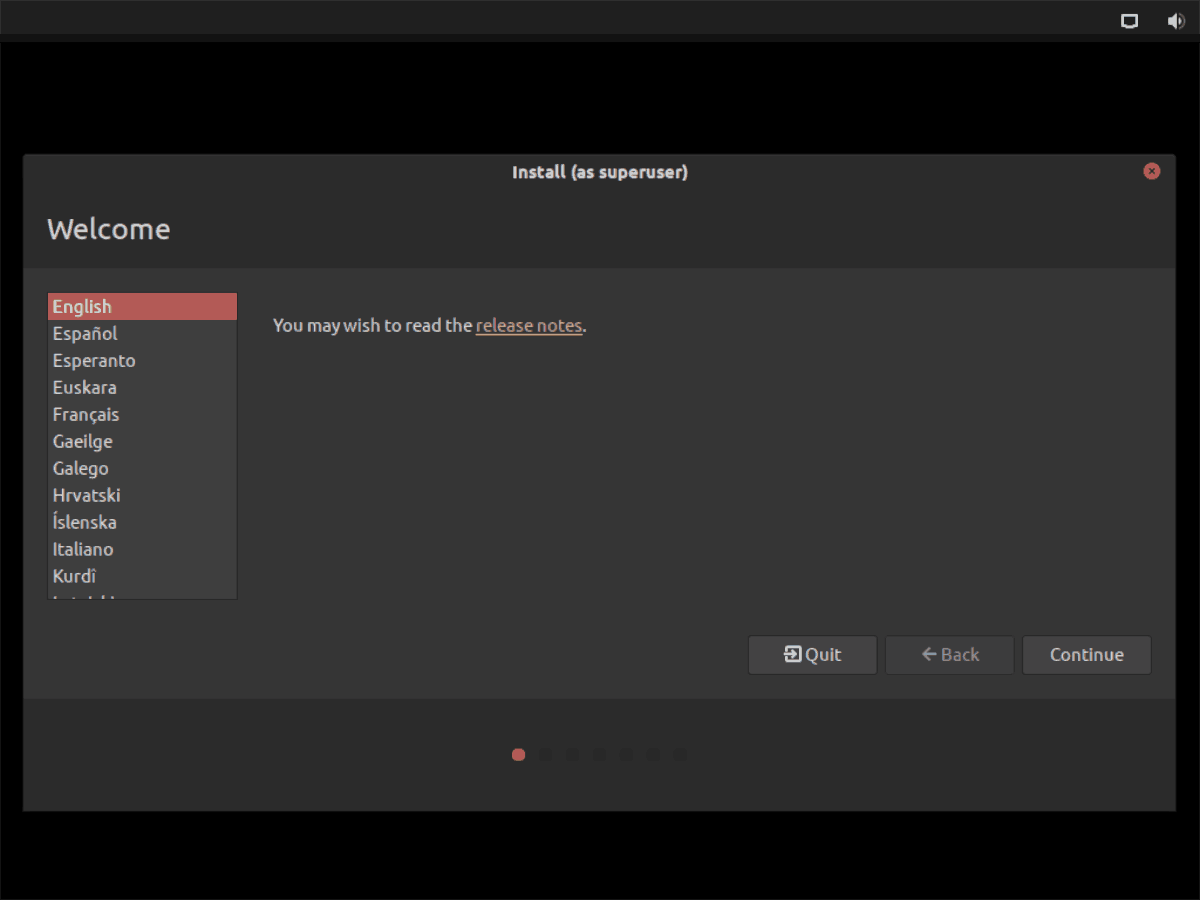 Upon choosing the “Install Peppermint OS” option with the keyboard, the live environment will load and present the “Welcome” screen. Look for the “Continue” button at the bottom of the page and click on it to move to the next page.