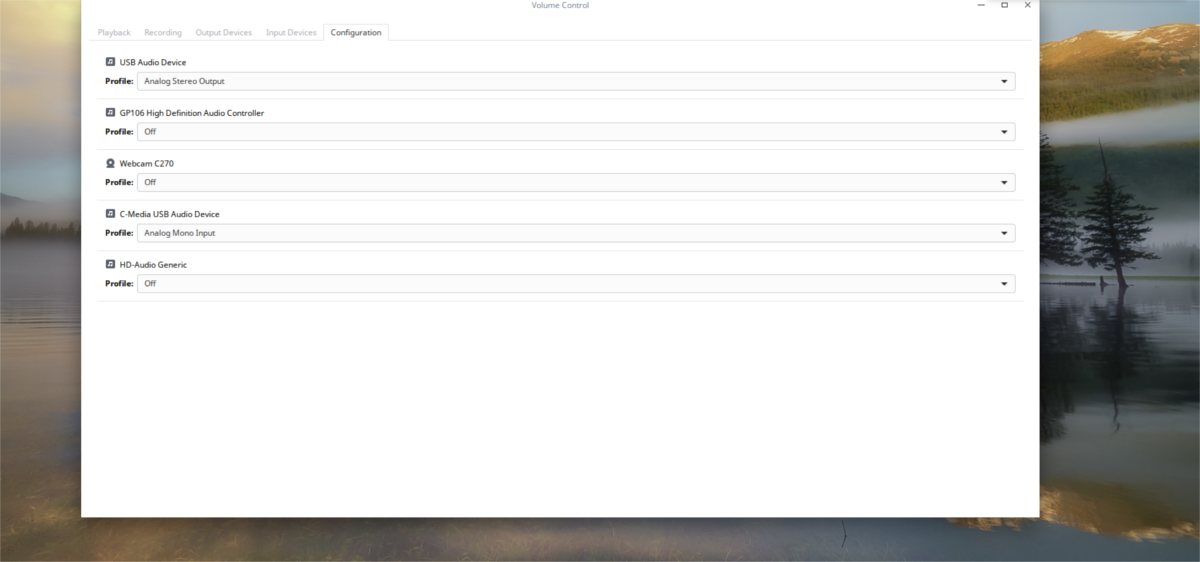 Lastly, the configuration section shows all of the audio equipment. In this section, users can easily turn on and off individual speakers, microphones and etc. To set a device as default, click the “fallback button”. Doing this makes this audio device the default, above all others.