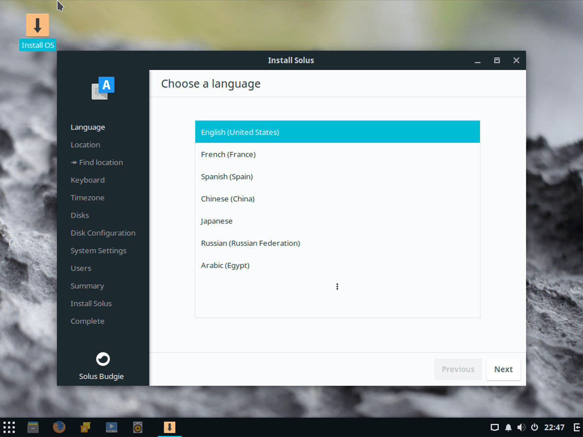 When the Solus live disk first starts up, you’ll see a desktop. It is entirely usable, so feel free to try it out before installing. After trying out the Solus desktop, look for “Install OS” on the desktop and double-click on it to open up the install program.