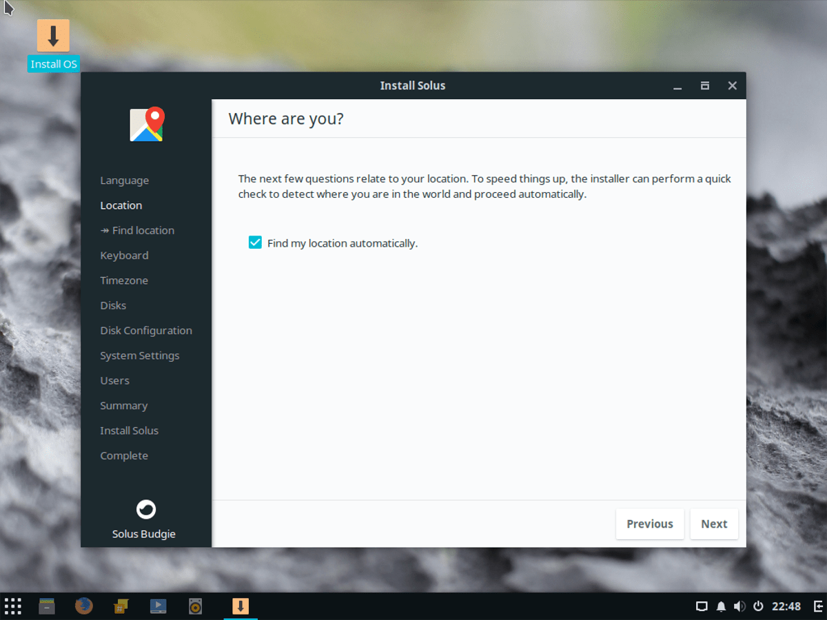 On the next page, you’re required to tell Solus your location. Don’t worry, “automatic location” is only so that the OS can more easily apply location-based settings. If you don’t feel comfortable, don’t click “find my location.”