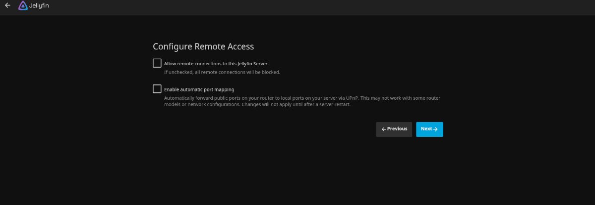 Step 6: On the next page, Jellyfin wants to set up remote access. If you want to access your Jellyfin media server outside of the network, check both boxes. If not, uncheck them and click “Next.”