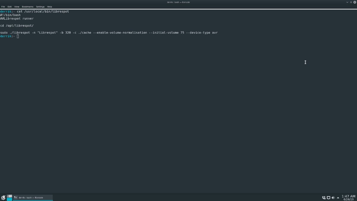 sudo ./librespot -n "Librespot" -b 320 -c ./cache --enable-volume-normalisation --initial-volume 75 --device-type avr