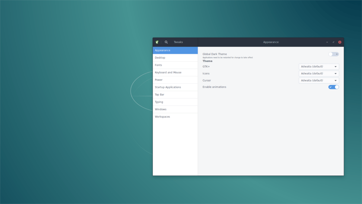 To disable animations in Gnome, open up the Tweak Tool. Inside the tool, look at the “Appearance” section. All the way at the bottom, there’s a slider next to “Enable animations.” Click the sider to turn off various window manager effects, transitions, etc.