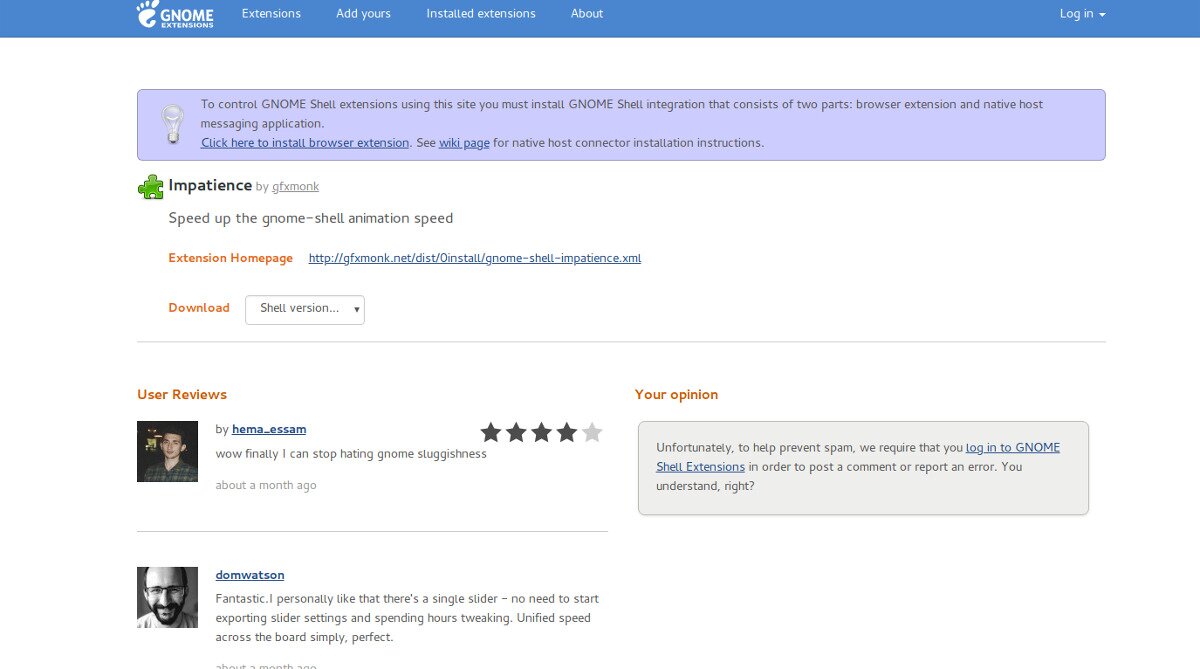 If turning off animations isn’t for you, there is a Gnome extension that will improve speed even further. Instead of disabling animations, it tweaks the settings so that the animations in Gnome are much faster. This modification is ideal for those with excellent PCs, who feel that the Gnome Desktop is slow (and not their computers). To get it working, head over to its page in the Gnome extension store, click the slider on the page and then select “install” on the pop-up.