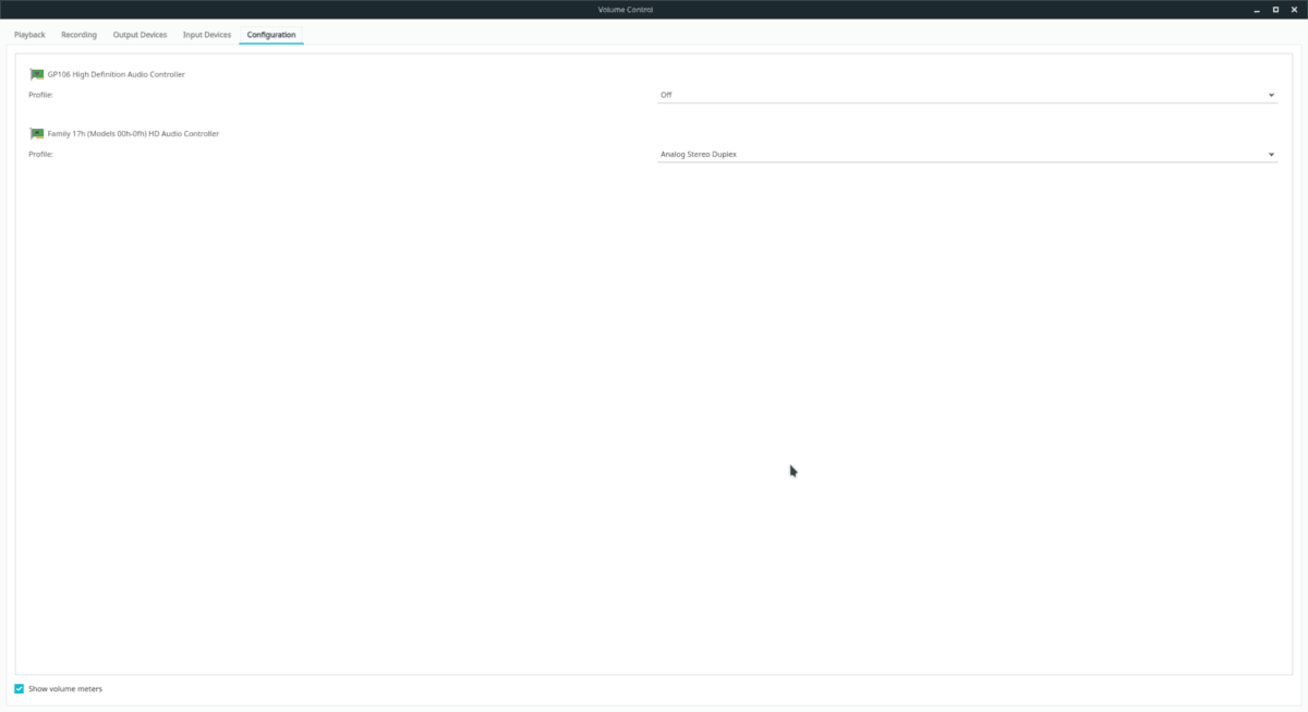 Have an audio device you want to disable permanently? Open up Pavucontrol and Click the “Configuration” button. Then, look through the list of sound devices on screen and find the one you want to turn off.