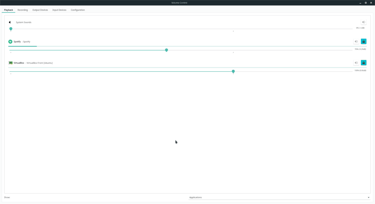 Managing audio playback for individual applications in the Pavucontrol playback tab works the same as the “system sounds” entry. Press the speaker icon on the right to mute, or drag the slider to adjust the volume.