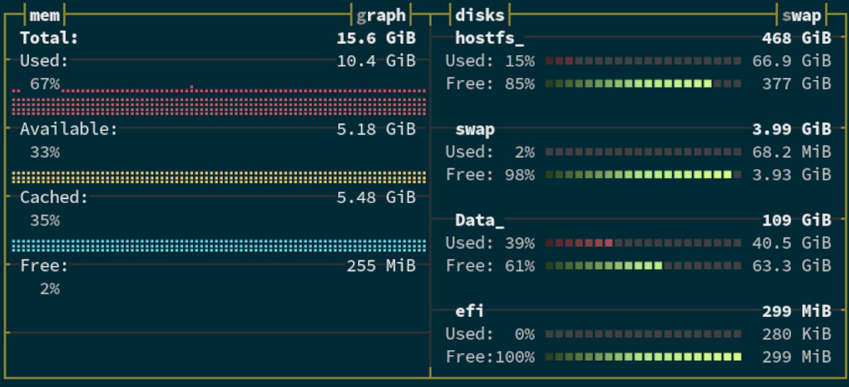 In addition to the graphs, you’ll also see the “Disks” box. This box shows how much each file-system connected to your CPU is using. For example, “swap” under the “Disks” section can show you how much of your system’s SWAP (virtual memory) is in use, etc.