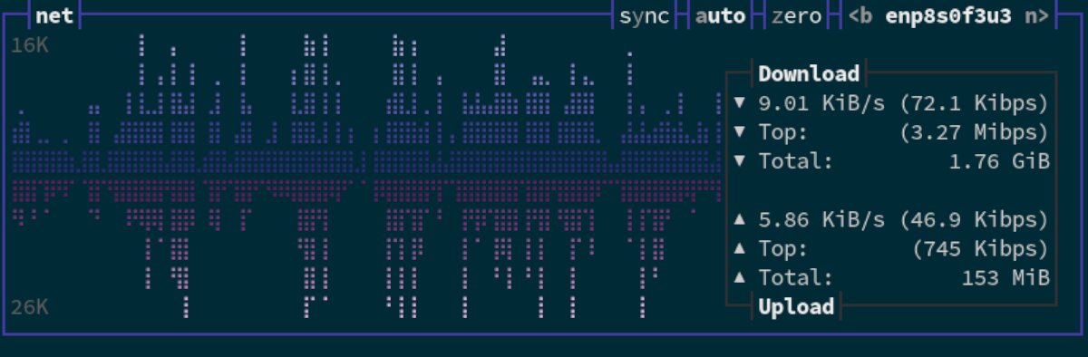In the “Net” box for Bpytop, you can monitor your upload speed and download speed. To view your upload speed, look to the blue section of the graph in “Net.” Blue represents upload. To view download speed, look at the purple area of the graph.