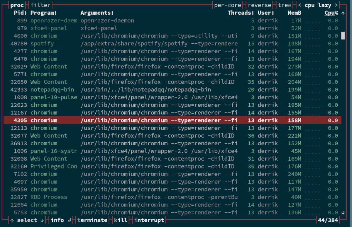 Bpytop allows you to manage your processes running on your Linux system. Here’s how to do it. First, look at the “proc” box. In this box, you’ll see a long list of each program running on the system, denoted by the user.