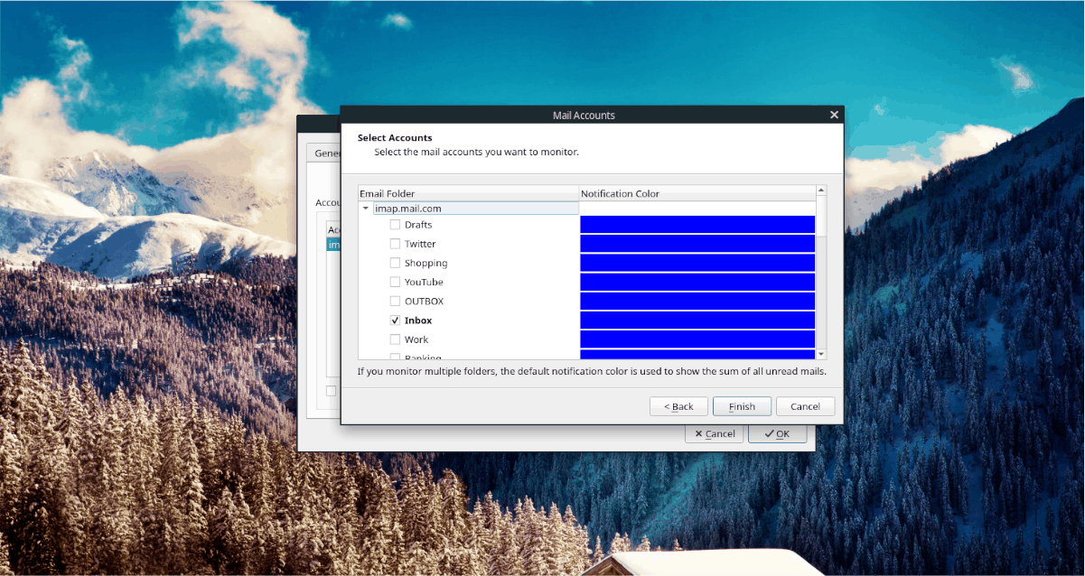 Step 4: Upon selecting your Thunderbird profile, Birdtray will list out various email folders in a list. Locate the email folders you would like to monitor with Birdtray, and check the boxes next to them. Then, click the “Finish” button.