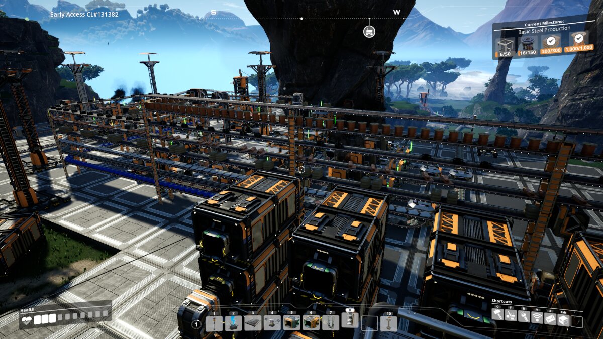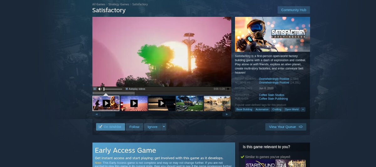 Satisfactory is a simulation game that puts the player into a 3D open world and tasks them with creating a functioning factory. Satisfactory was developed and published by Coffee Stain Studios. It was released on Steam in early access, allowing it to run on Linux via Proton/Steam Play.
