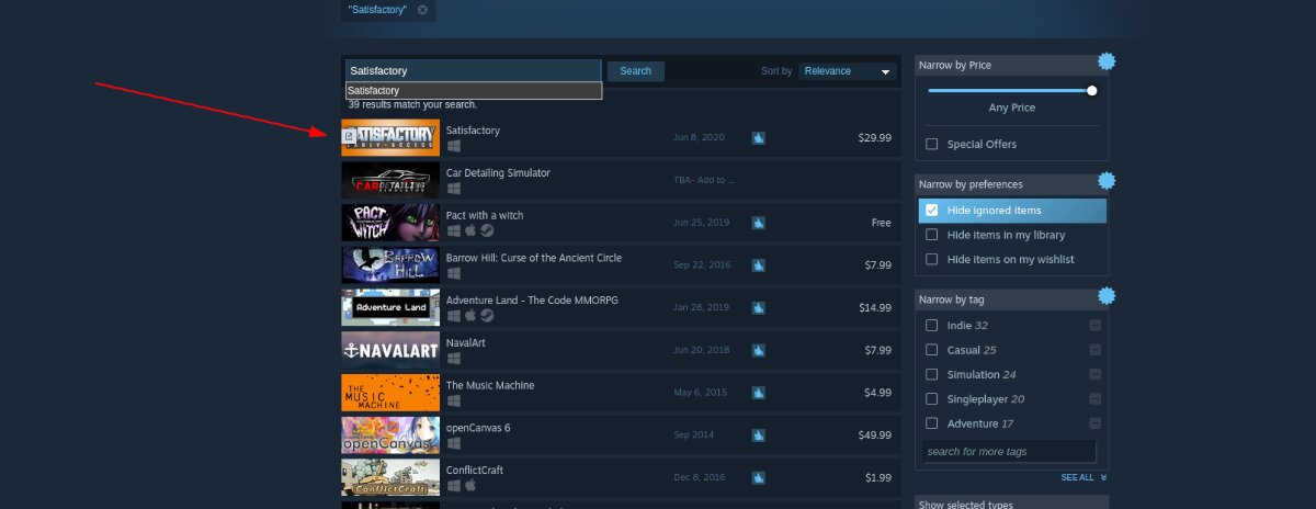 Step 2: Locate the “STORE” button at the top of the page, and click on it. Inside the “STORE” area, click on the search button, and look for “Satisfactory.” Then, click on it to head over to the Satisfactory Storefront page.