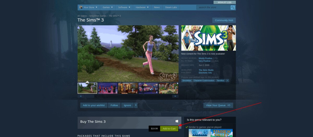 Step 4: Click on “The Sims 3” in the search results to go to its store page. After that, find the “Add to cart” button and purchase it to add it to your library. Currently, the game is 19.99 USD.