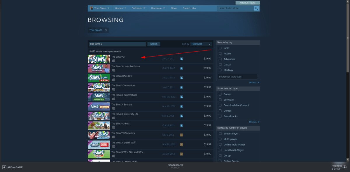 Step 5: After purchasing The Sims 3 on Steam, click on “Library” to go back to your game library. Look for “The Sims 3” in your list of games, and select it with the mouse.