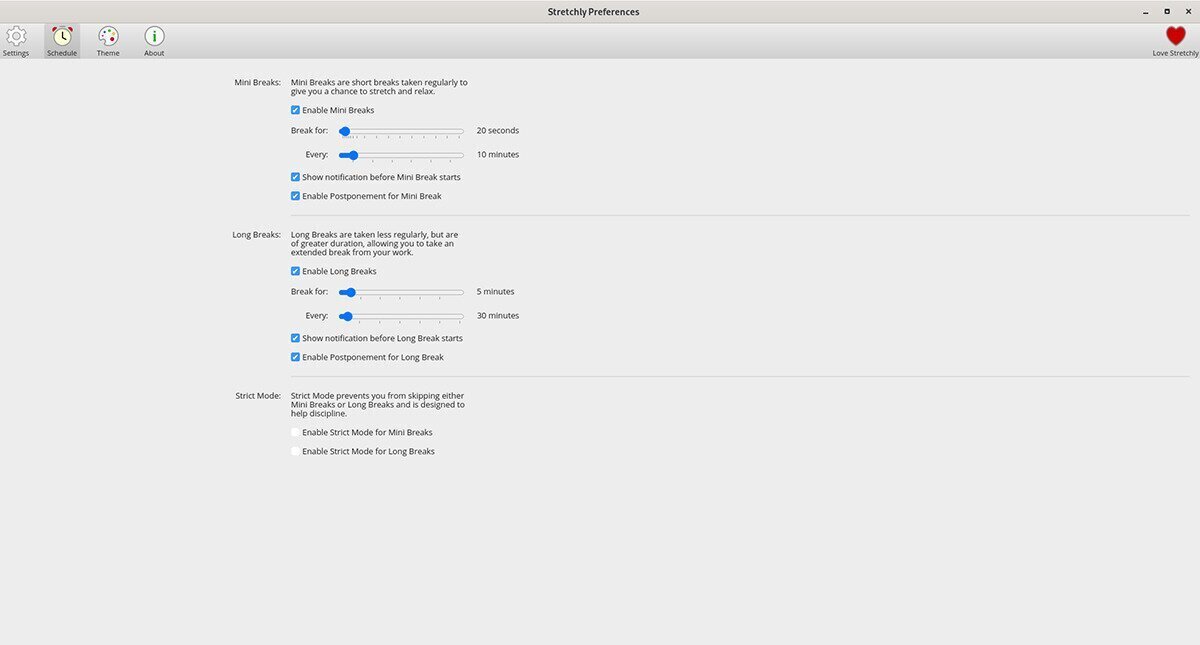 Step 4: Once you’ve defined your “mini breaks” in the “Schedule” section of Stretchly, it is time to define your “long breaks.” Using the slider, determine how long (or short) your long breaks should be. Then, modify the “Every” slider to your liking.