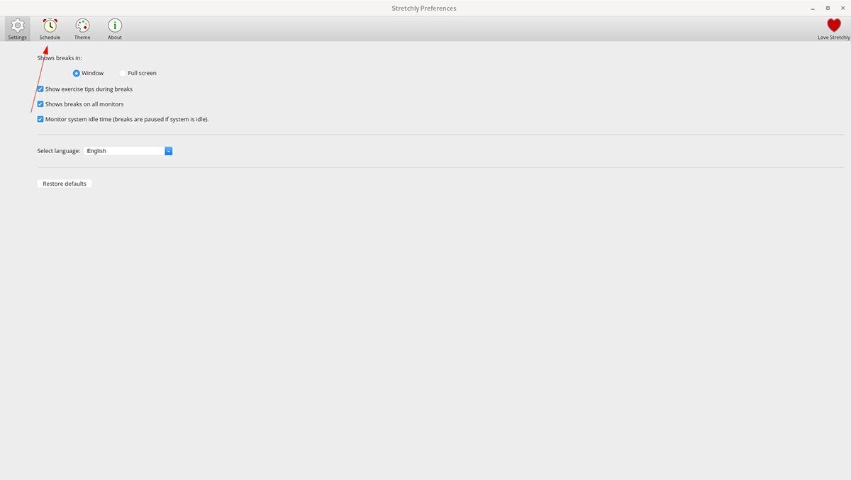 Step 2: After selecting your language, find the “Open preferences” button and select it with the mouse. From here, you’ll see the Stretchly app settings. In this window, find the “Schedule” section, and click on it with the mouse.