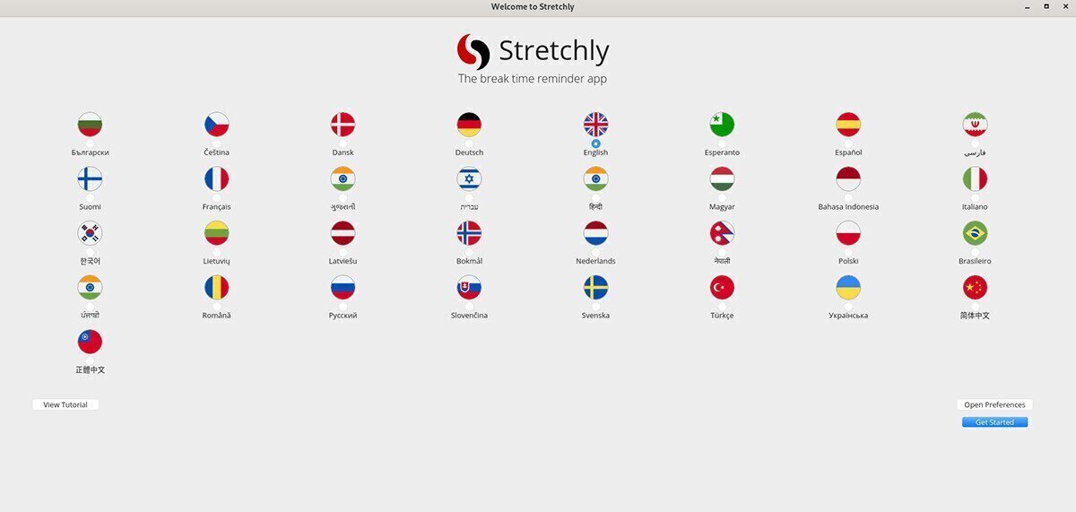 Step 1: There are tons of languages to choose from. Each of the languages is represented by country flags. Using the UI, select the language you prefer to use Stretchly in.