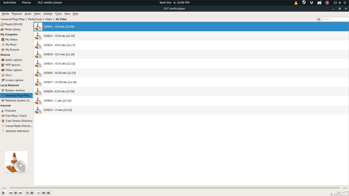 Inside of VLC, click the playlist button to take VLC into playlist mode. Once in playlist mode, look for the “Local Network” section. Under this section there are a few options. Click on “Universal Plug’n’Play”. Doing this will bring up your Mediatomb server in the playlist browser as a folder. Click on the folder and browse through to access your media. Start playback by double-clicking on the individual media file.