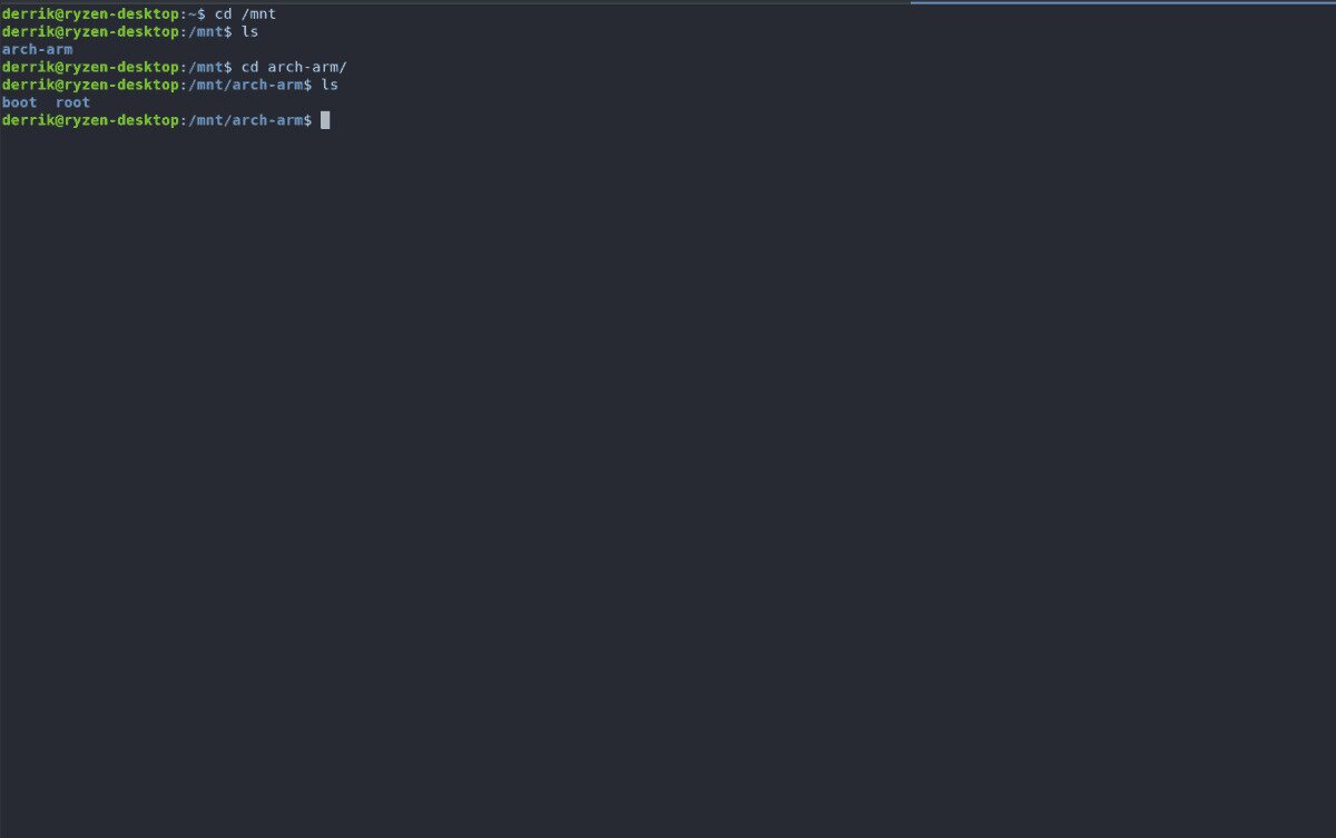 mount /dev/sdX2 /mnt/arch-arm/root
