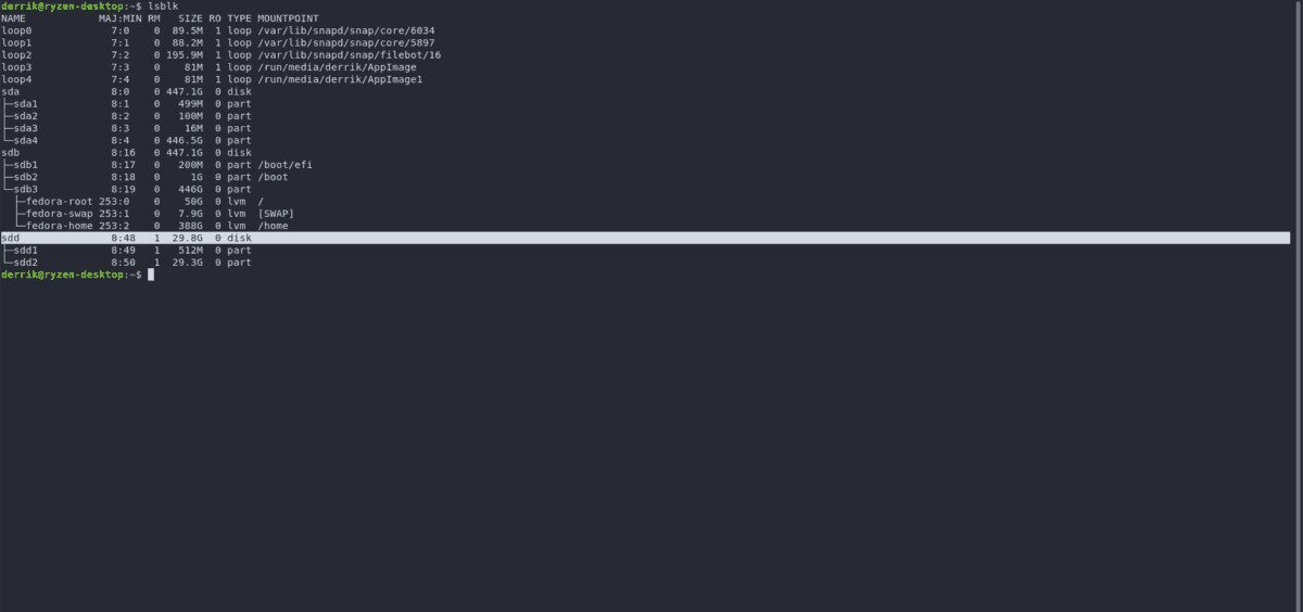 Run the lsblk command to view the output of all of the block devices on the system. Locate your SD Card’s label.