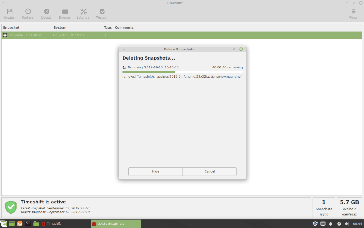 To make a snapshot in Linux Mint with the Timeshift tool, find the “Create” button and click it. As soon as the “Create” button is selected, a window will pop-up on the screen and create a snapshot. Wait as it creates the snapshot, as the process will most likely take a lot of time to complete.