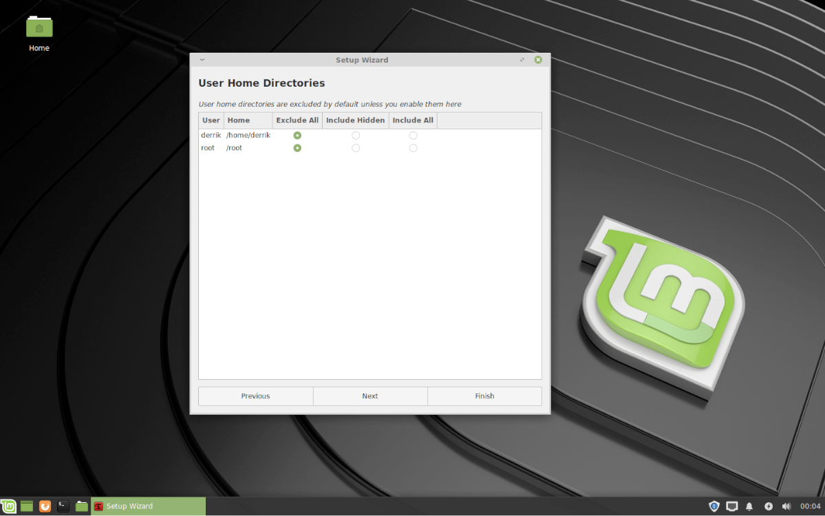Go through the list of home directories and check the box next to “Include All” for each one you wish to add to the snapshot configuration in Timeshift. Leave home directories you want to exclude set to “Exclude All.” Also check “Include Hidden,” if you want Timeshift to save your backups and configuration files. Once your selections are made, click the “Next” button to move to the final page.