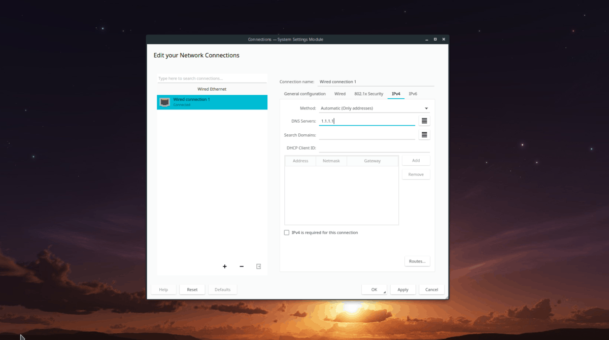 In the IPv4 area, locate the “Method” box, and change it to “Automatic (only addresses).” Then, find the “DNS Servers” box. In this box, write out the Cloudflare DNS IPv4 addresses.