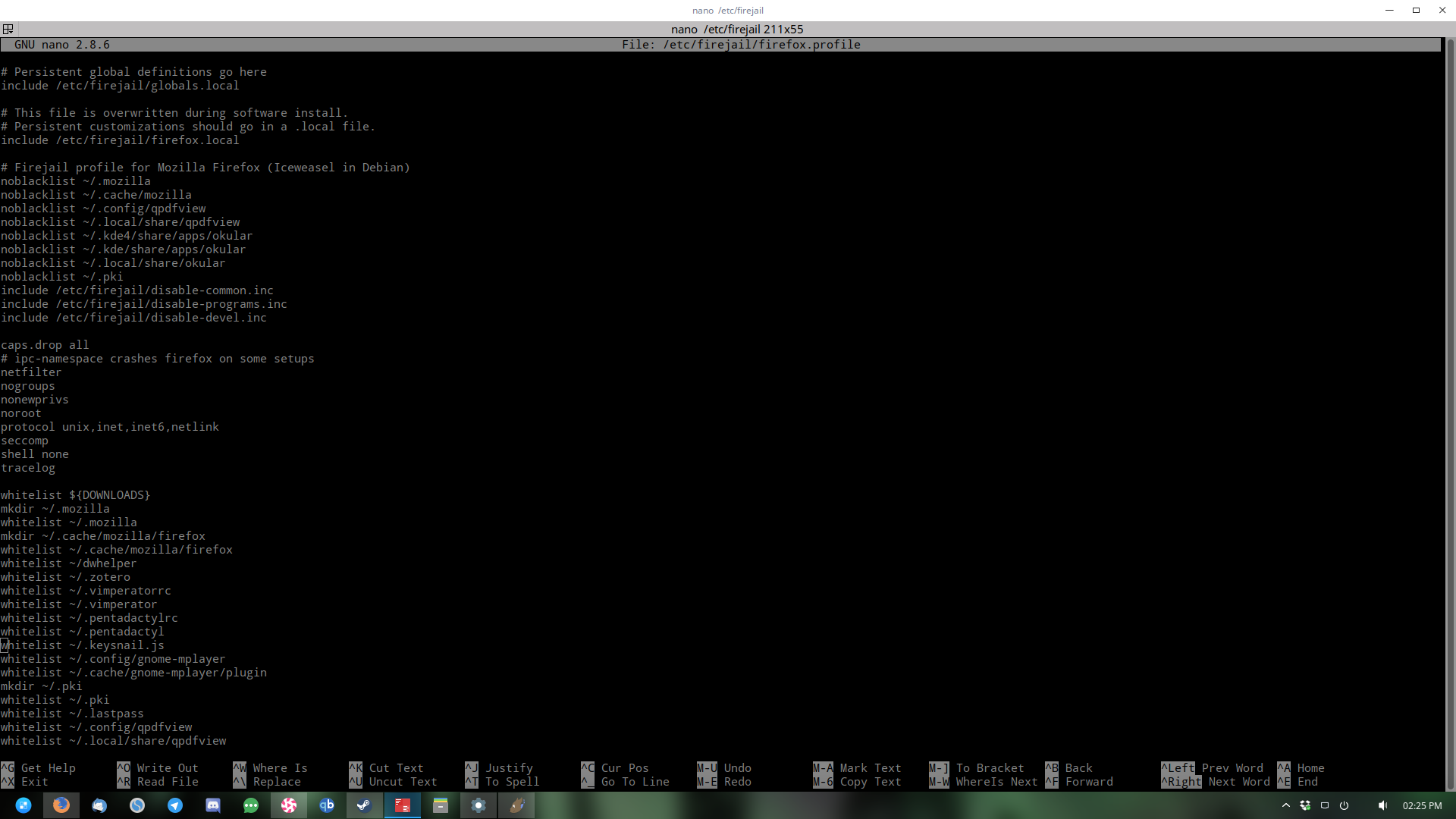 As stated before, the Firejail app has sane defaults. This means the developers have gone through and set up defaults that should work for most users. For example: though the app is jailed, the ~/Downloads directory, and plugin directories on the system are available. To add more items to this whitelist, go to the section of the config file where everything is being whitelisted, and write your own rules.