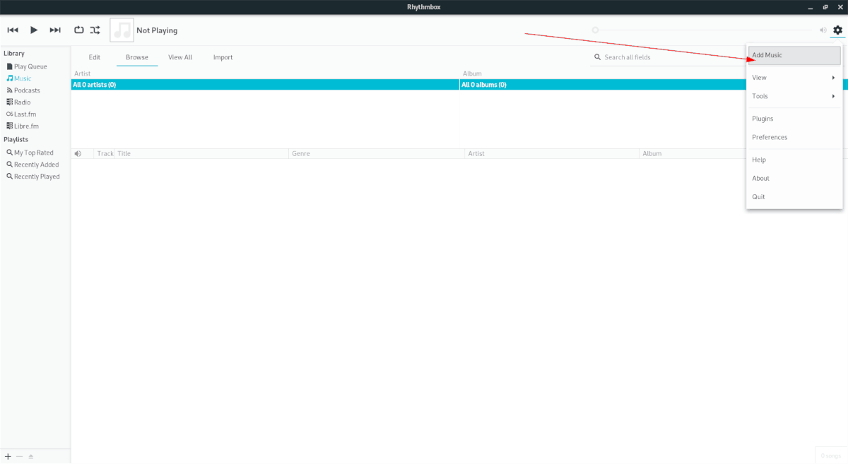 Instead, to add the music files to your Rhythmbox library that you’ve previously placed in ~/Music, you must do the following.